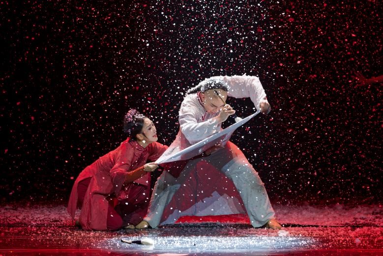 舞剧《曹雪芹》以序(百年怀想)、四幕(知交京华、空劳牵挂、如梦大观、隻立千古)为结构,通过使用大量时间倒叙和时空交错手法,并以抒情写意的舞蹈语汇再现了曹雪芹超越个人命运悲欢、在北京西山创作传世经典《红楼梦》的独特人生经历。