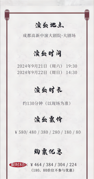 4、电子票可兑换纸质票,如需兑换,请您于演出开演前至成都高新中演大剧院1号门至售票厅兑换纸质票后检票入场。请您保持票张完整、清洁。正(副)联缺失,或者擅自涂改、遮挡票面内容的,均视为无效票谢绝入场。