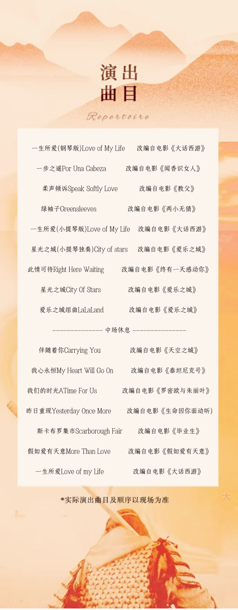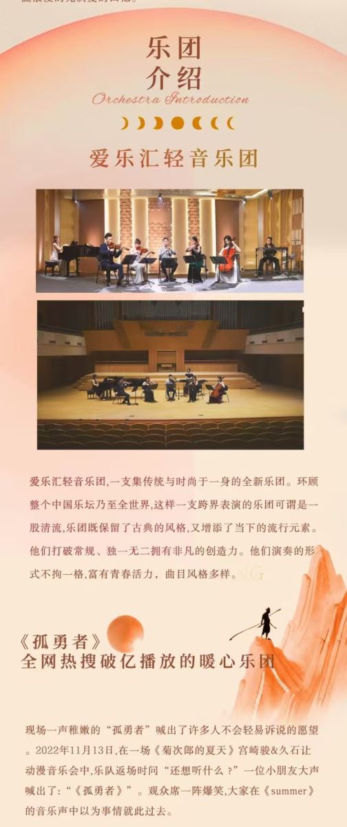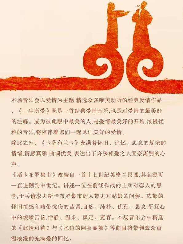 5、一般情况下,演出中途需要离场的观众,请在乐章结束或幕间再离开座位。中场休息或需要暂时离开时,请记得携带票券,便于顺利返回,继续欣赏演出。