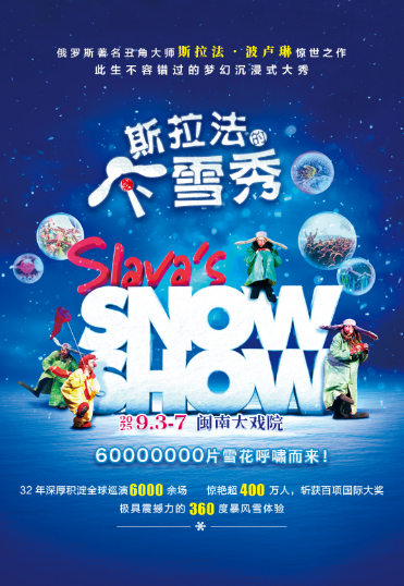 《斯拉法的下雪秀》(Slava'sSnow Show)是俄罗斯著名丑角大师斯拉法,波鲁林(Slava Polunin)的惊世之作。该演出揉合了默剧、形体、舞台视效,和知名的乐曲表现出天马行空的创意和令人惊叹不已的舞台效果。自1993年在莫斯科普希金艺术中心创立开始,已经游走了全球40 多个国家 200 多个城市,在全世界热爱艺术的城市里一次次挥酒暴风雪所带来的意想不到的人生体验。看过的观众都动容地表示,真的要非常感谢最后出现的“暴风,好特别的夜晚,舍不得回家。