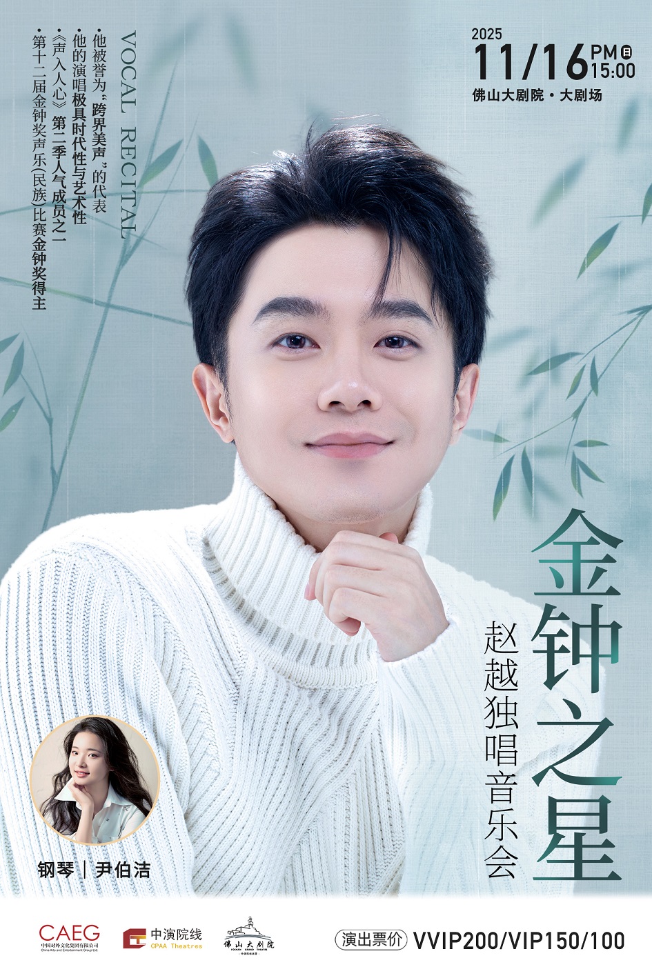 赵越的演出足迹横跨海内外知名艺术殿堂,亮相上海国际艺术节、深圳南山流行音乐节等顶级艺术盛会,献声人民大会堂、国家大剧院、北京音乐厅、上海东方艺术中心等国家级演艺地标。合作乐团包括中国国家交响乐团、中国爱乐乐团、广州交响乐团、深圳交响乐团、上海爱乐乐团等国内一流音乐团体。