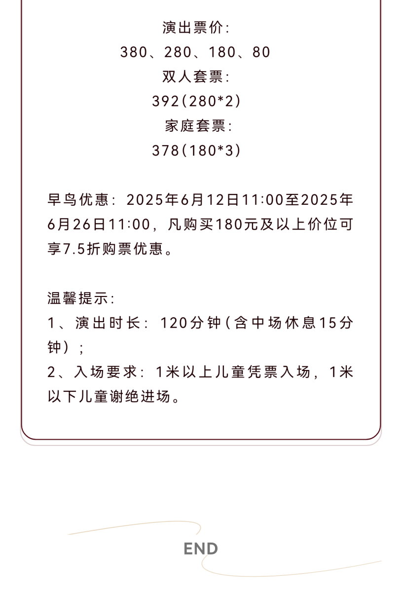 5、观演过程中,除特殊声明以外,谢绝一切舞台画面的录音录像,感谢您的配合。