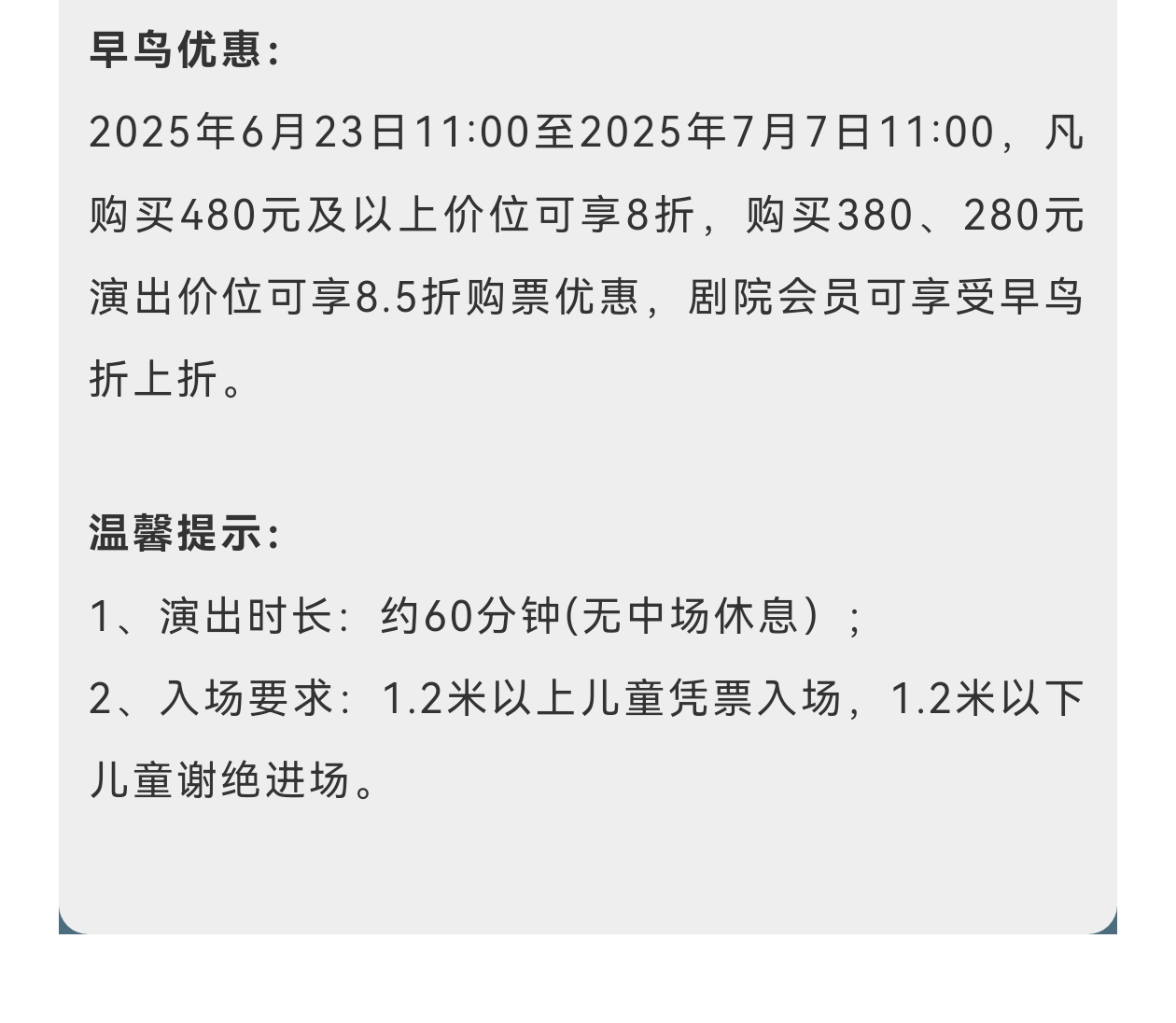5、观演过程中,除特殊声明以外,谢绝一切舞台画面的录音录像,感谢您的配合。