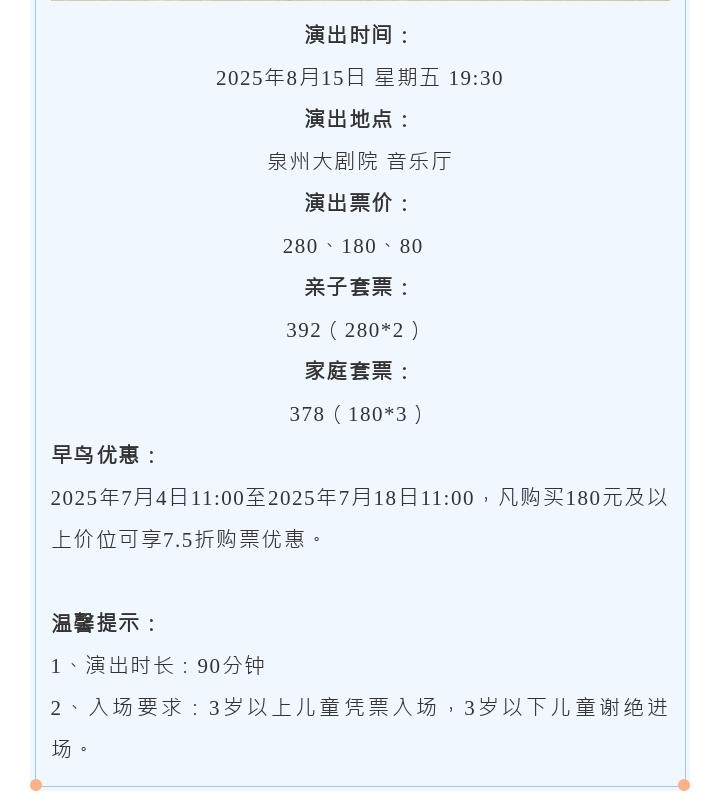 4、为保障观众的消费权益,购买歌剧厅池座(一层)、二层、三层门票的观众仅能凭票进入对应楼层,对号入座,严禁跨层入场。请观众提前半小时入场,每人一券,儿童全票,1.2米以下儿童谢绝入场。