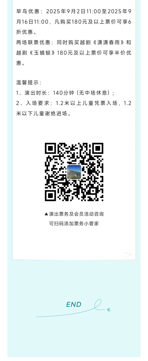 1、演出票是观众进入剧场观演的唯一有效凭证,为有价证券,非普通商品,其背后承载的文化服务具有时效性,稀缺性等特征,一经售出,不退换、不记名、不挂失、不补办。请购票人务必妥善保管演出票,如因个人原因不慎将演出票丢失、损毁或遗失副券均无法进场观演。