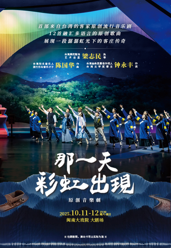 《那一天,彩虹出现》由苗北艺文中心及客家委员会共同主办,果陀剧场梁志民导演,台湾流行歌曲天王陈国华作曲,客家诗人钟永丰作词,并齐聚台湾影视界精英官灵芝、徐淳耕、镇万钧、吴侑函主演,用动人歌曲呈现苗栗客家庄三代人的生命故事。2023年甫一公演便引起轰动,广大的回响促使此剧走出苗栗,走出台湾,走向大陆,来到厦门!
