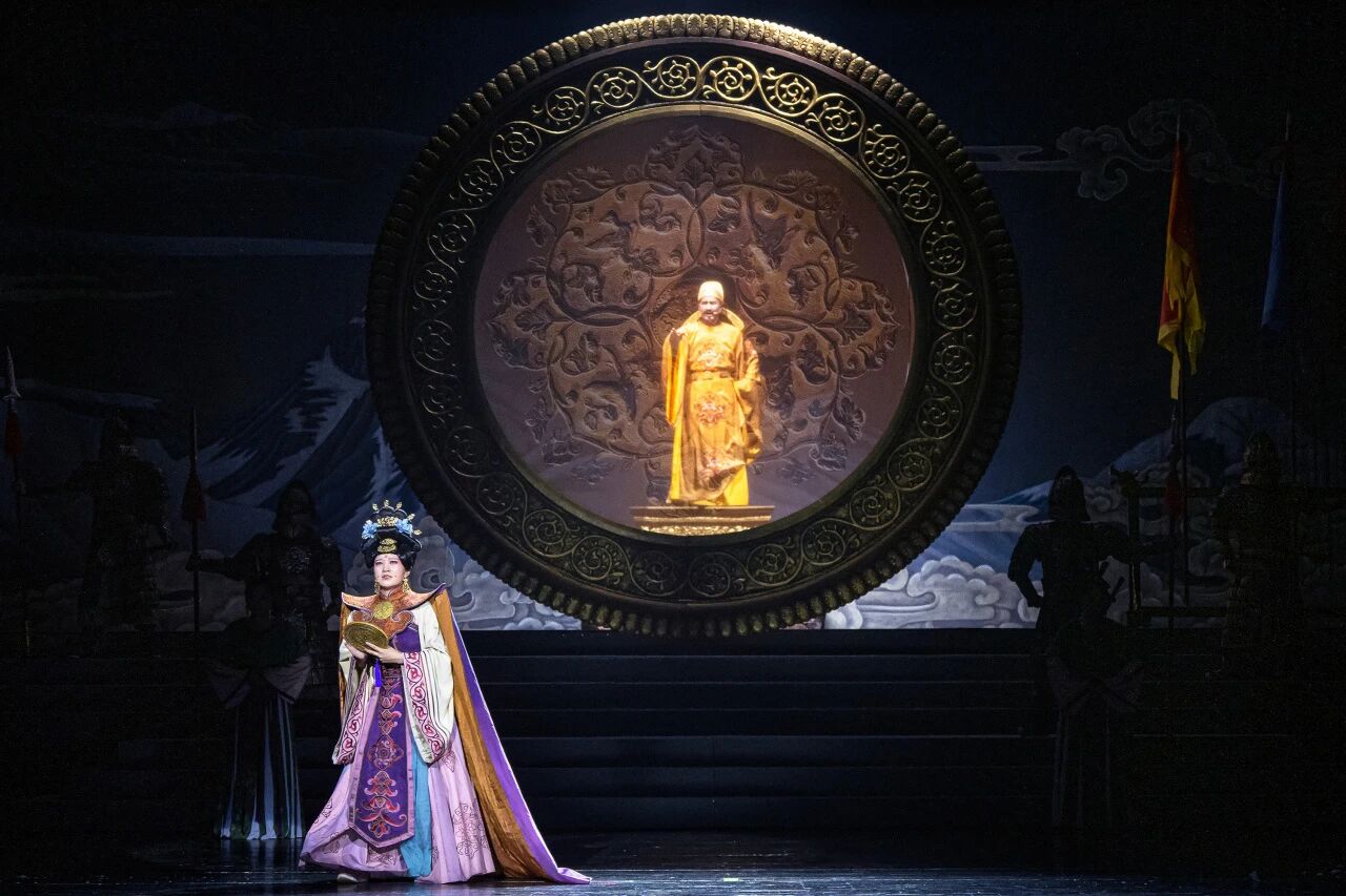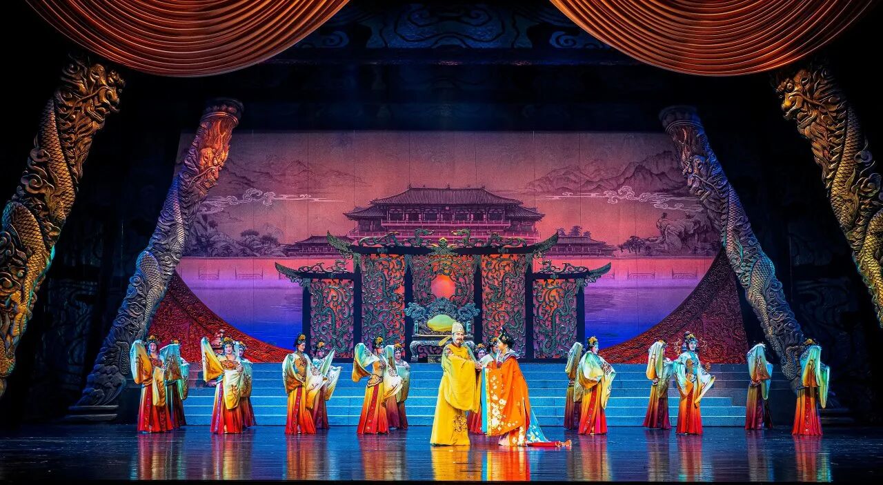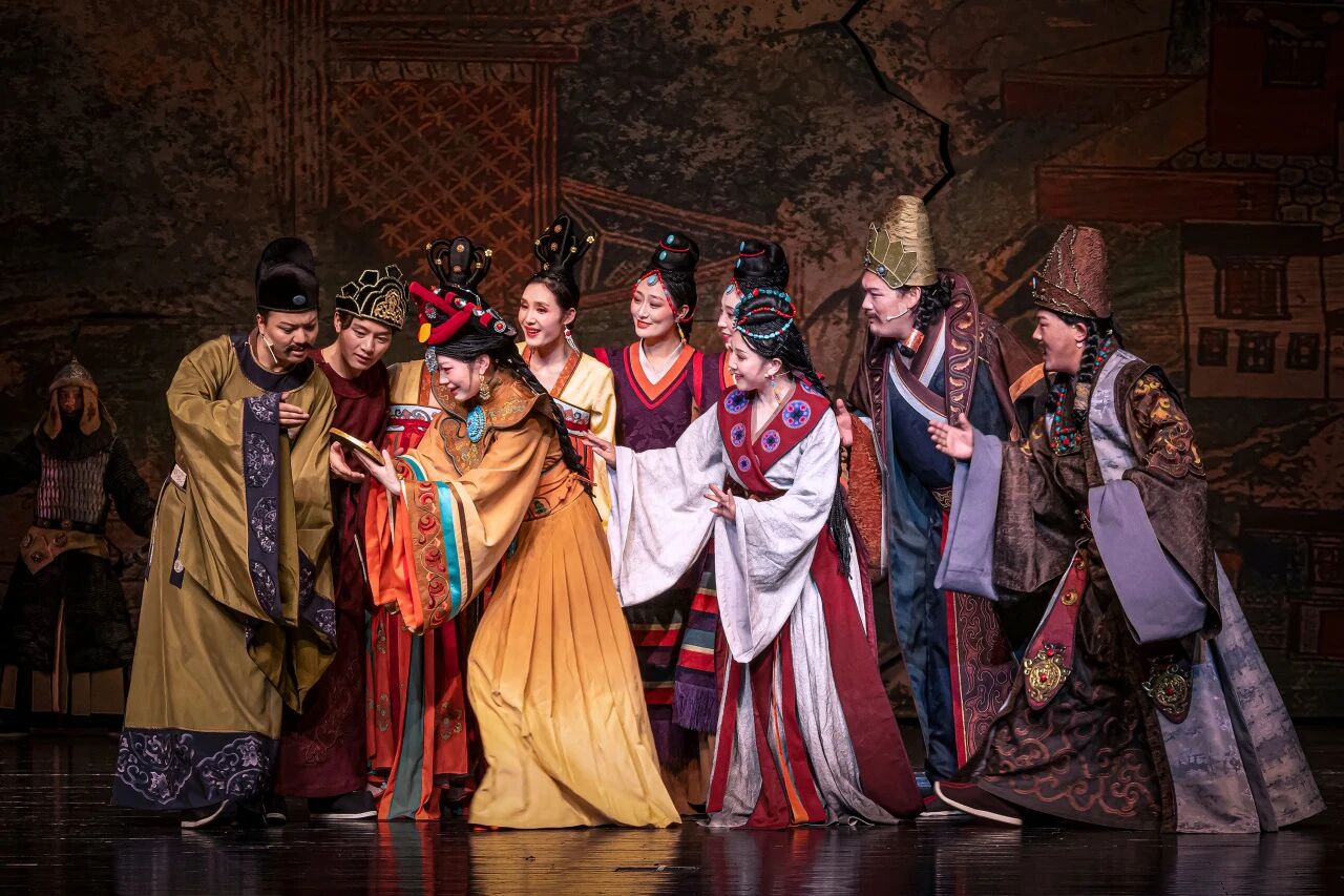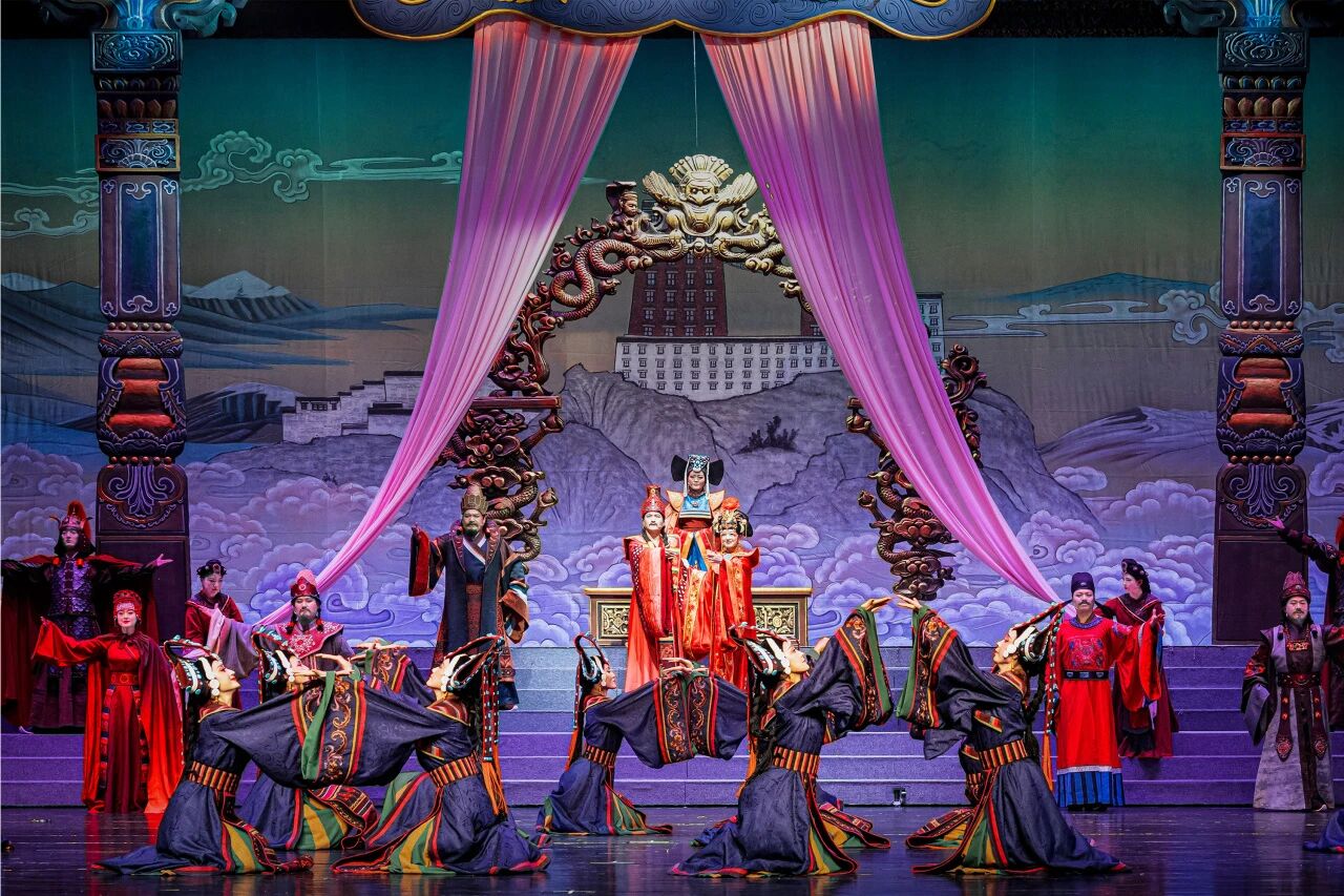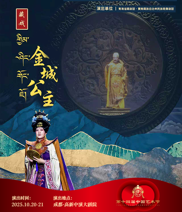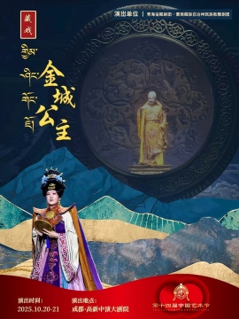 藏戏《金城公主》以唐代唐蕃和亲为历史背景,通过艺术再现金城公主远嫁吐蕃的壮阔历程,彰显了中华民族共同体意识与民族团结的时代主题。剧目讲述了金城公主历经乱世童年、西行入蕃、宫廷变故、力促会盟等重要人生阶段,以其坚韧与慈悲周旋于唐蕃之间,最终促成两地和平、传播中原文明的感人故事。核心冲突集中于和亲背后的政治博弈与个人命运的挣扎,情感基调崇高而悲壮,塑造了一位有血有肉的和亲公主形象。艺术上,该剧创新融合传统藏戏与现代表演手法,以"沉浸式多维舞美"营造历史时空,通过“汉藏音乐融合”将藏戏固有的唱腔与大型管弦乐及现代音乐语汇有机结合,形成独具特色的舞台审美,增强了戏剧的感染力与当代价值。