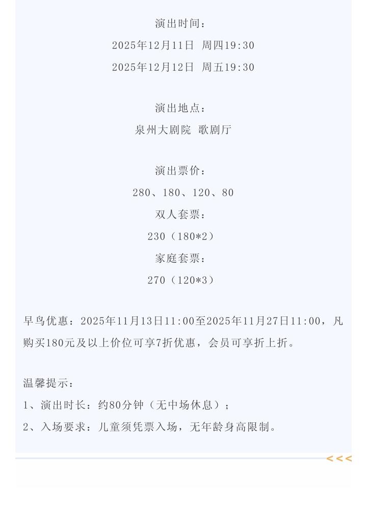 4、为保障观众的消费权益,购买池座(一层)、二层、三层门票的观众仅能凭票进入对应楼层,对号入座,严禁跨层入场。请观众提前半小时入场,每人一券,儿童全票,儿童须凭票入场,无年龄身高限制。