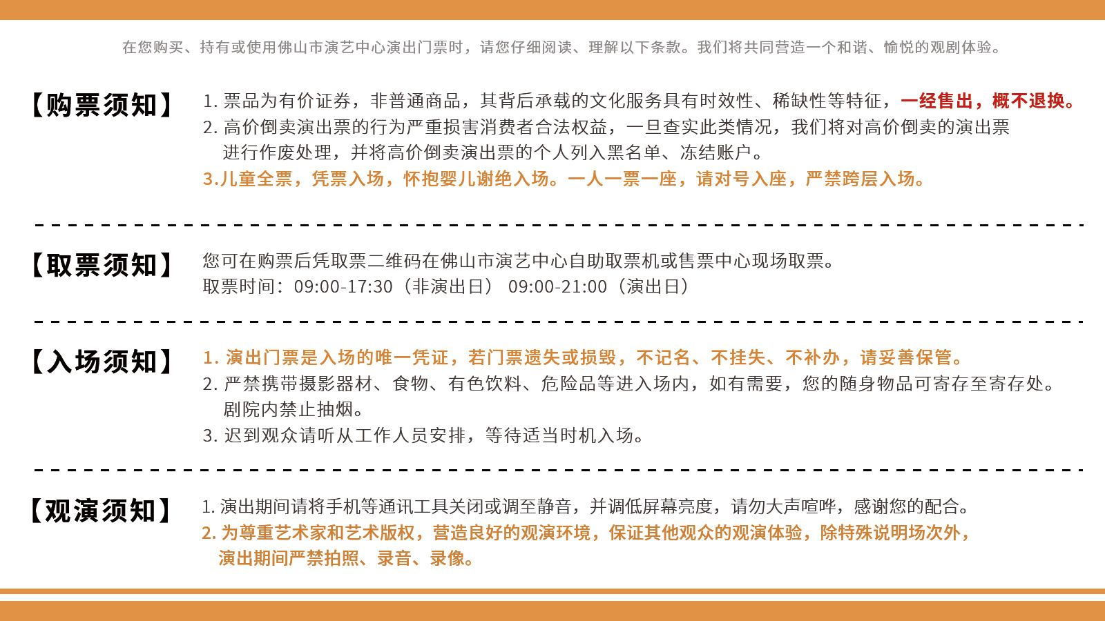 1.购票前请确认所购场次和价位。演出票是观众进入剧场观演的唯一有效凭证。所有演出票一经售出,不退换、不记名、不挂失、不补办。请购票人务必妥善保管演出票,如因个人原因不慎将演出票丢失、损毁或遗失副券均无法进场观演。