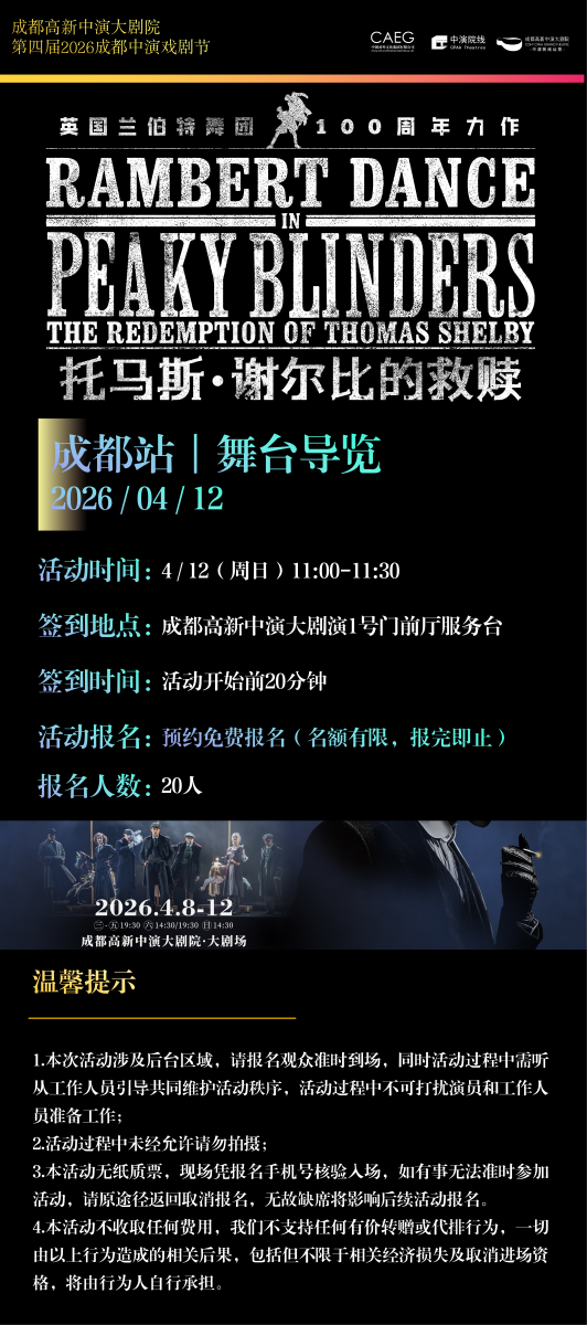 1.本次活动涉及后台区域,请报名观众准时到场,同时活动过程中需听从工作人员引导共同维护活动秩序,活动过程中不可打扰演员和工作人员准备工作;