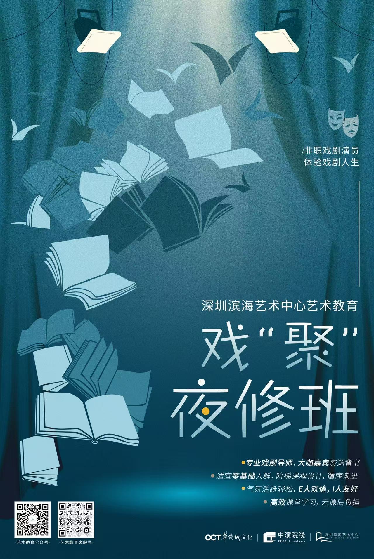戏剧爱好者进阶课程 —— 戏 “聚” 夜修班,于工作日晚间开课,每月一期,每期含四次课程。本课程以组建 “深圳滨海艺术中心非职剧团” 为目标,凭借高规格剧院资源优势,诚邀资深戏剧导演与表演导师精心规划课程并授课。