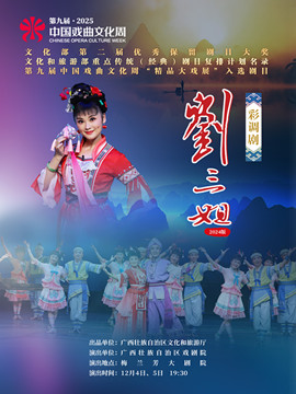 彩调剧《刘三姐》首演于1959年,是中国舞台艺术的经典。该剧取材于壮族歌仙刘三姐的传说故事,以对自由和幸福生活的追求为主题,讲述了刘三姐为了维护人生的自由和尊严,以山歌进行顽强抗争的故事,成功塑造了勤劳善良、美丽聪敏、真率泼辣、能歌善舞的刘三姐形象。