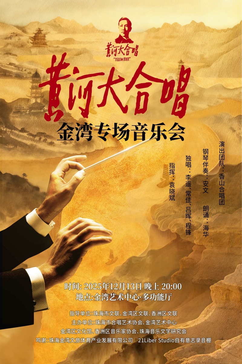 香山合唱团将于2025年12月13日赴珠海市金湾区,在金湾艺术中心举办《黄河大合唱》专场音乐会。此次演出为香山合唱团继南沙、香湾、星海专场之后的第四场《黄河大合唱》音乐会。