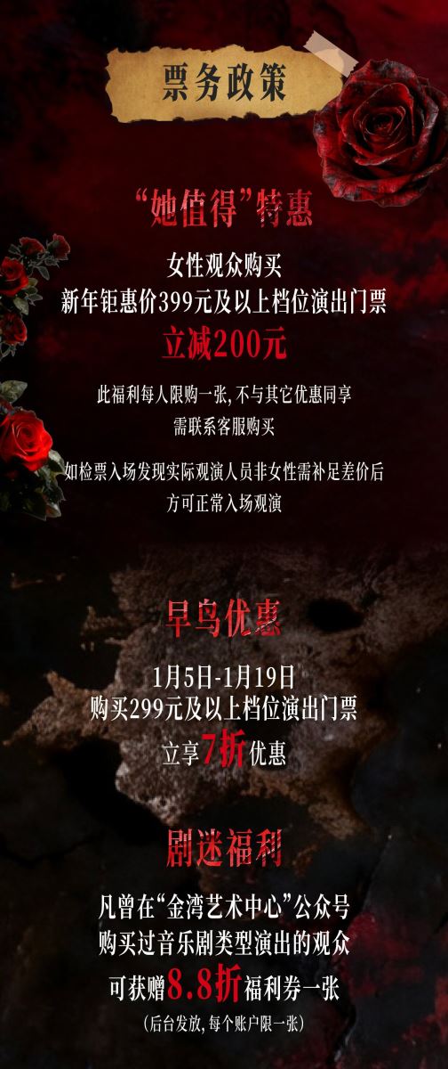 4、剧迷福利:凡曾在“金湾艺术中心”公众号购买音乐剧的观众,可获赠8.8折福利券一张(后台发放,每个账户限一张)